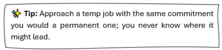✔️ False! Many employers hire for permanent roles from the temp pool. Temporary roles can open more doors than you might expect. Many employers use temp jobs as a way to find long-term talent, and it's not uncommon for these roles to turn permanent. They also give you the chance to build skills, gain experience, and grow your professional network.