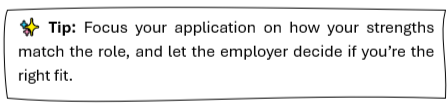 ✔️ False! You can be a strong candidate without meeting all requirements. You don’t need to tick every box to be a strong candidate. Job descriptions often list an ideal mix of skills, but employers know that the perfect applicant rarely exists. If you meet most of the key requirements and can show your potential, it’s worth applying.
